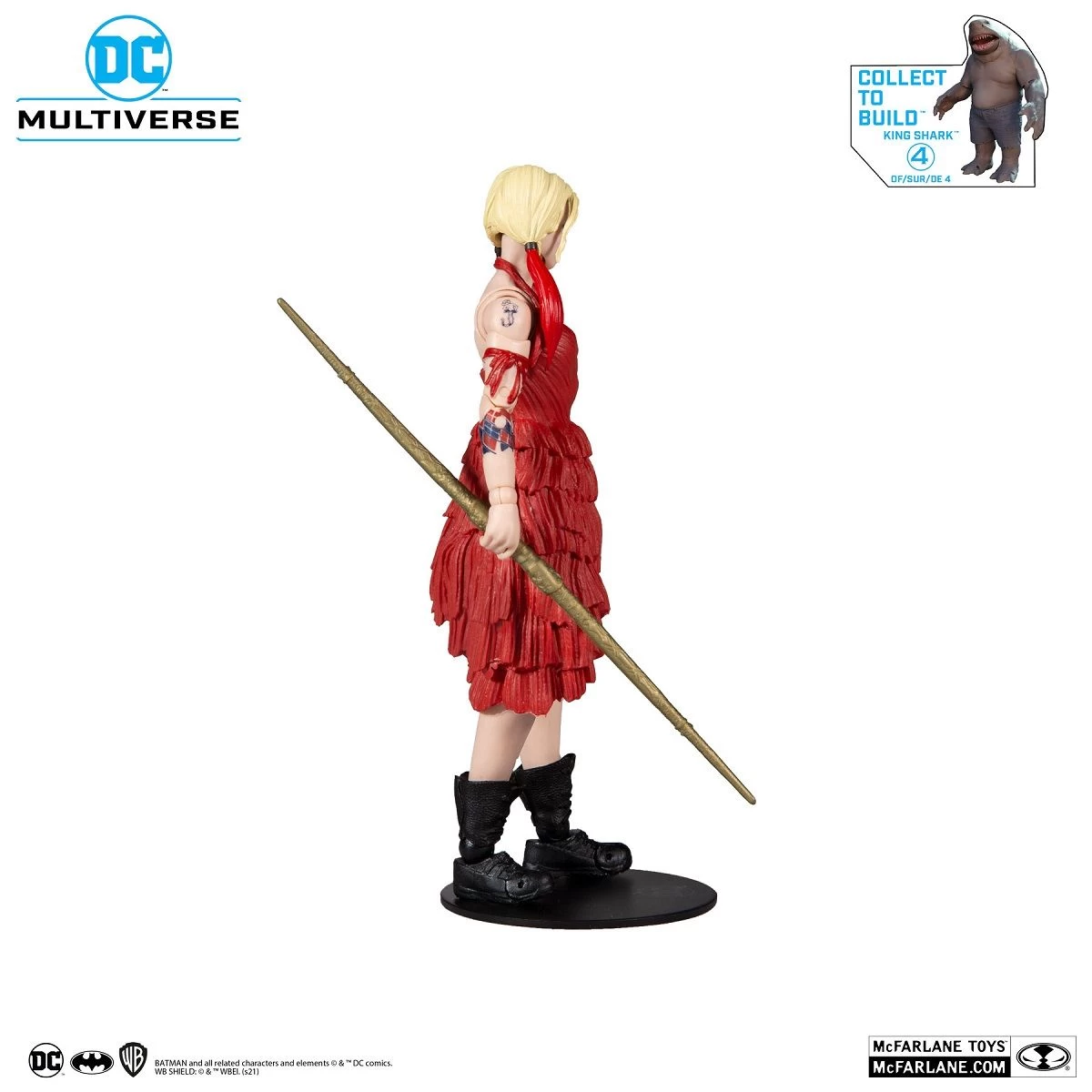 - Harley Quinn wird mit einem Speer und einer Basis geliefert