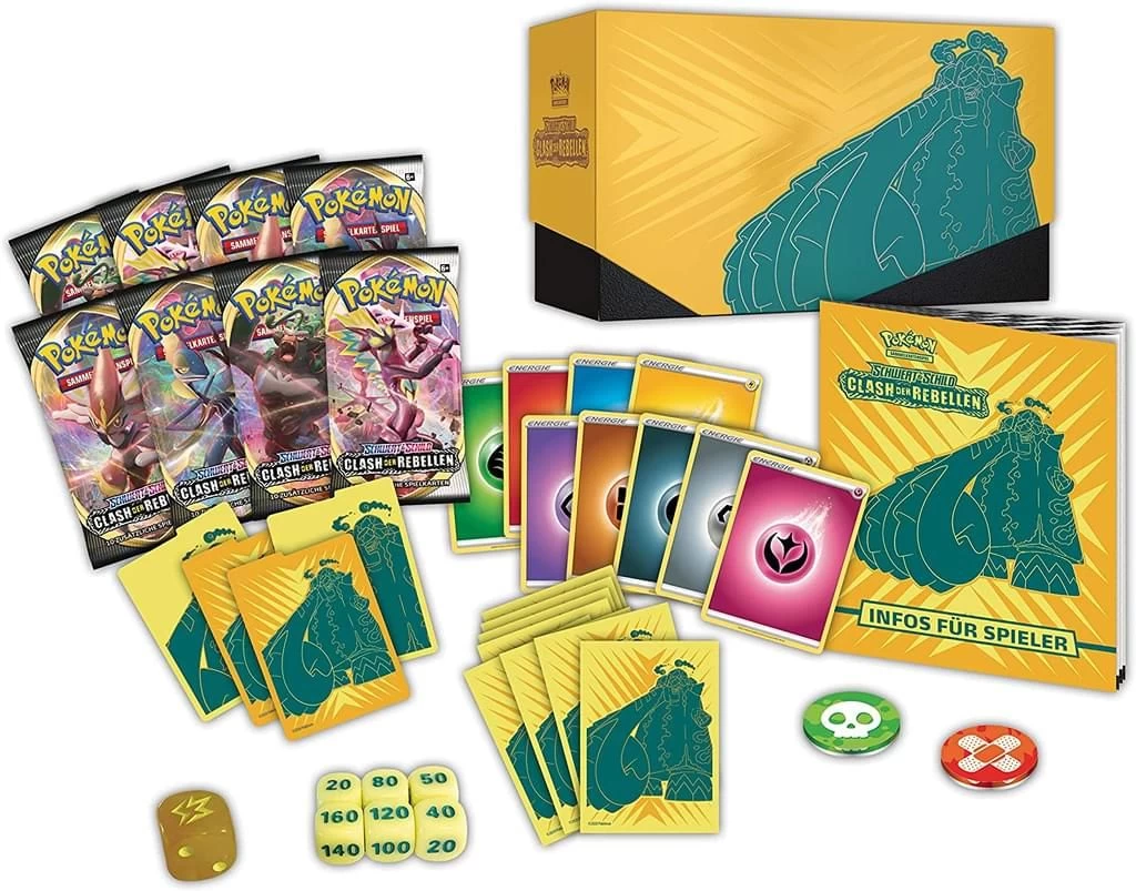 Pokémon Box der Erweiterung Clash der Rebellen in Deutsch. Abrocken mit neuen Pokémon! Dreh auf und lass es krachen – Rebellion, Chaos und punkige Noten durchdringen die Pokémon-Sammelkartenspiel-Erweiterung Schwert & Schild – Clash der Rebellen. Pokémon-V wie Riffex-V, Zwollock-V, Bellektro-V, Sanaconda-V und auch eine Handvoll Pokémon-VMAX – die letzten Entwicklungen der drei ersten Partner-Pokémon sowie Patinaraja-VMAX und Katapuldra-VMAX – treten auf. Die Erweiterung Schwert & Schild – Clash der Rebellen ist auf der Bühne genauso zu Hause wie in den Straßen!