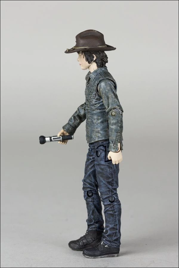 Die bewegliche Figur des Jungen Carl Grimes kommt mit Cowboyhut, großem Kerzenständer aus Terminus, geöffneter Konservendose, sowie einer Taschenlampe als Zubehör.