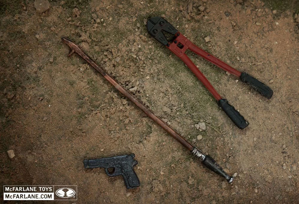 Die bewegliche Figur von T-Dog kommt mit abnehmbarer Weste, Bolzenschneider, Pistole und Schürhaken.